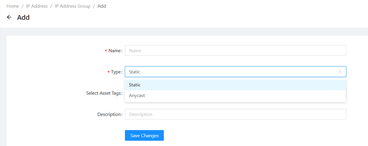 IP Adress > IP Adress Groupsection, and add a properIP Address Groupwith type Static or Anycast depending the setting on the coresponding load proxy node.Abstract