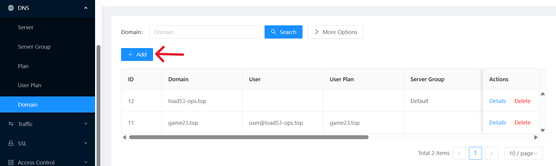 DNS > Domainsection on the side bar. , selectaddbutton to define a new Domain ZoneTip