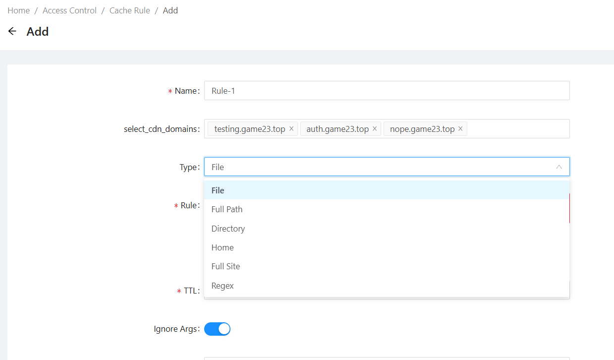 缓存规则可应用于多个用户CDN域名。用户可按以下目标类型定义缓存规则: