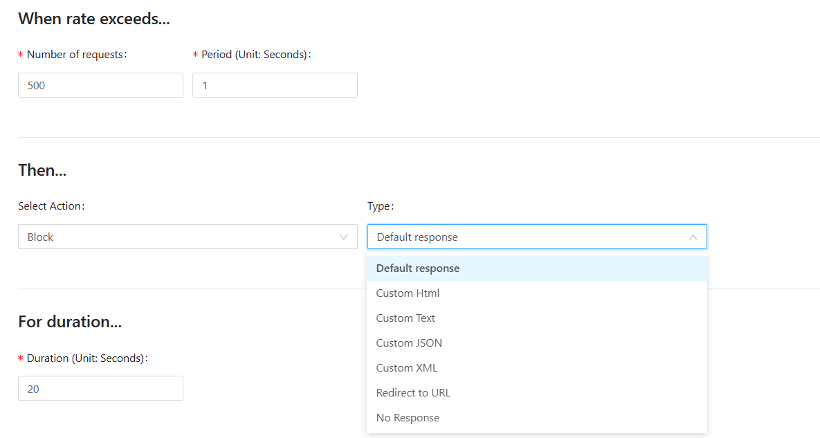 一旦超过阈值,将触发拦截响应。类型可自定义为多种响应方式: