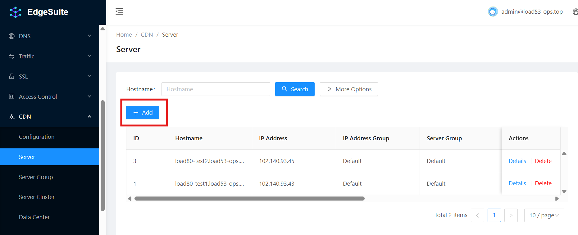 EdgeHit Controller 与 Load Proxy 安装完成后,需手动将节点添加至EdgeHit Controller控制面板。Load Proxy可作为CDN服务器或DNS服务器添加至EdgeHit Controller。