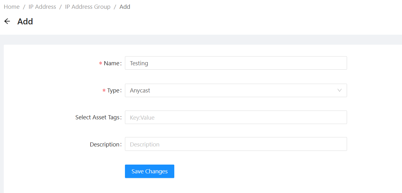 IP地址 > IP地址组部分,添加IP地址组类型选择静态或任播(根据Load Proxy节点配置)概述