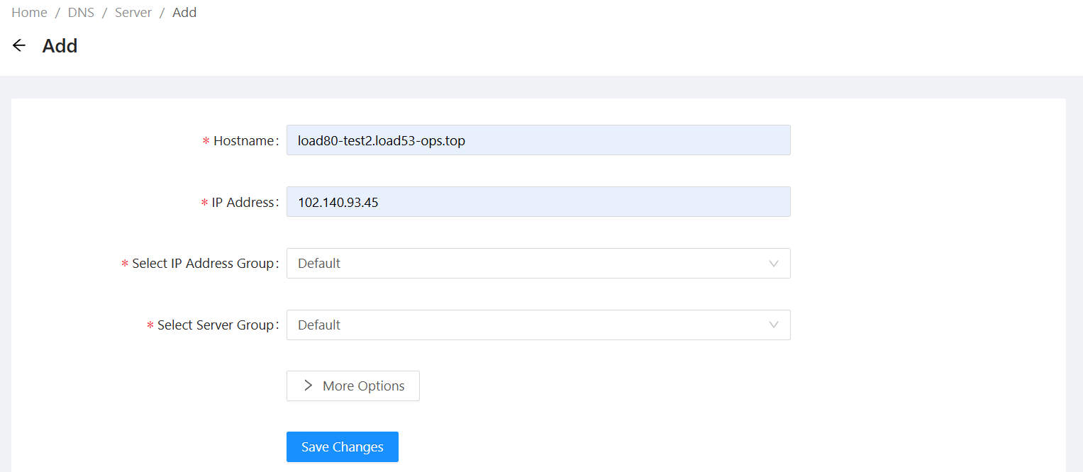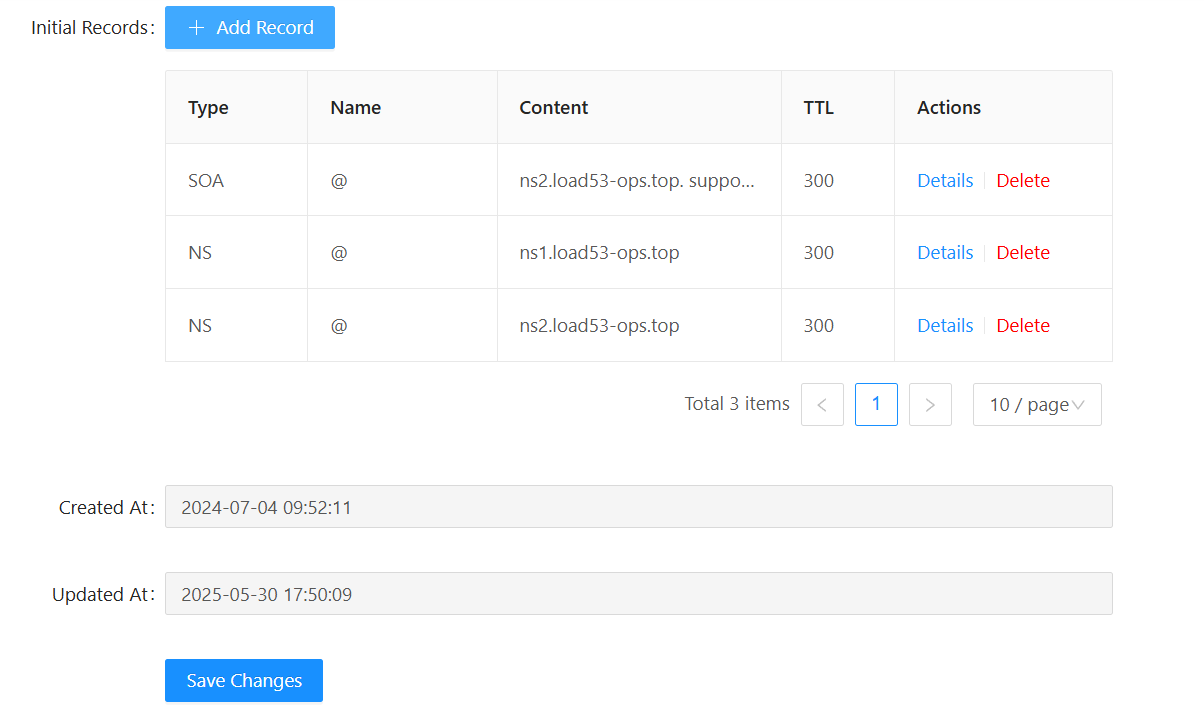 DNS组的初始记录适用于该组下所有域名,通常为指向一个或多个Load Proxy节点IP的NS记录。