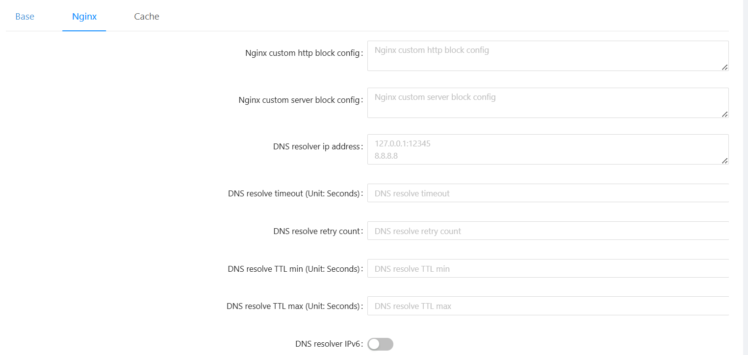 此部分允许对每个 EdgeHit CDN 服务器的 Nginx 运行时行为和 DNS 解析逻辑进行微调。