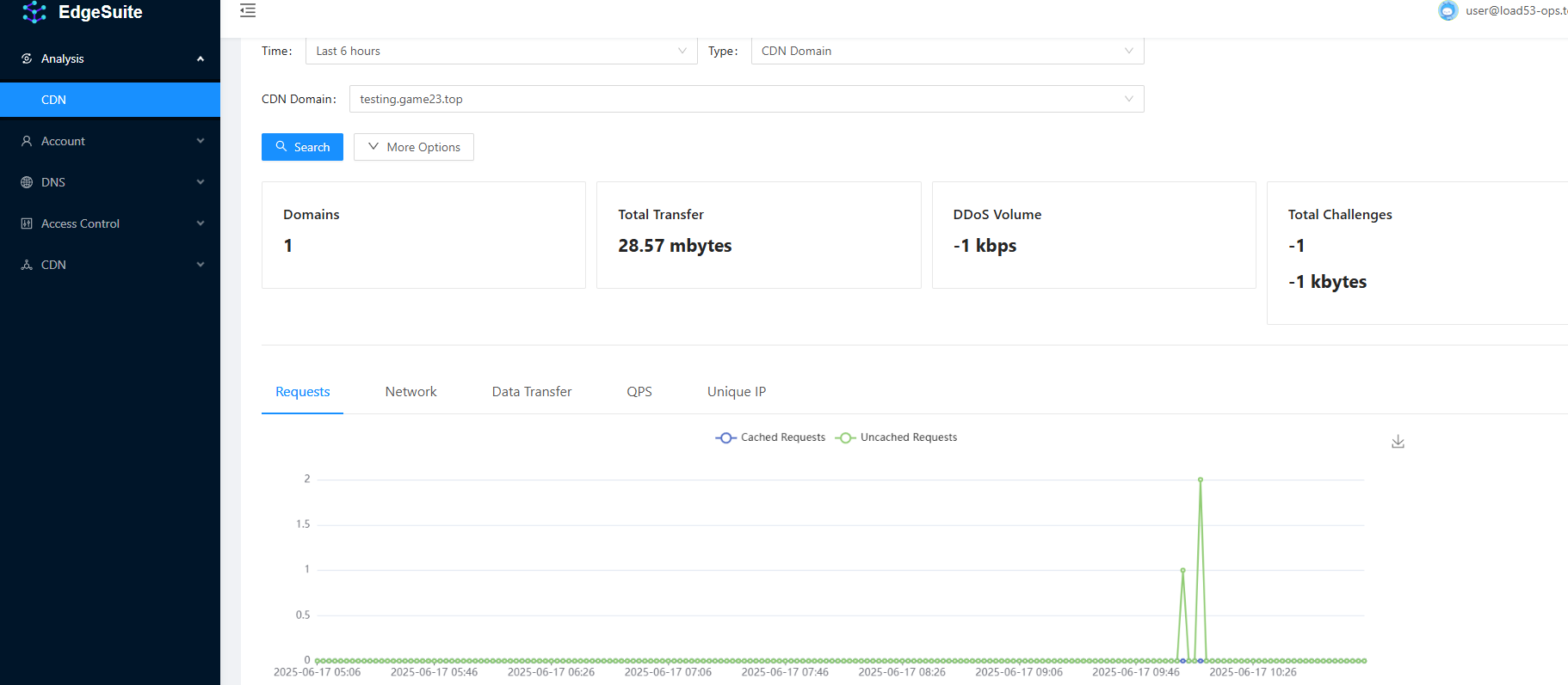分析 > CDN部分查看CDN使用情况分析。该部分将显示每个CDN域名的总使用量,并提供带时间轴过滤的多视图展示注意