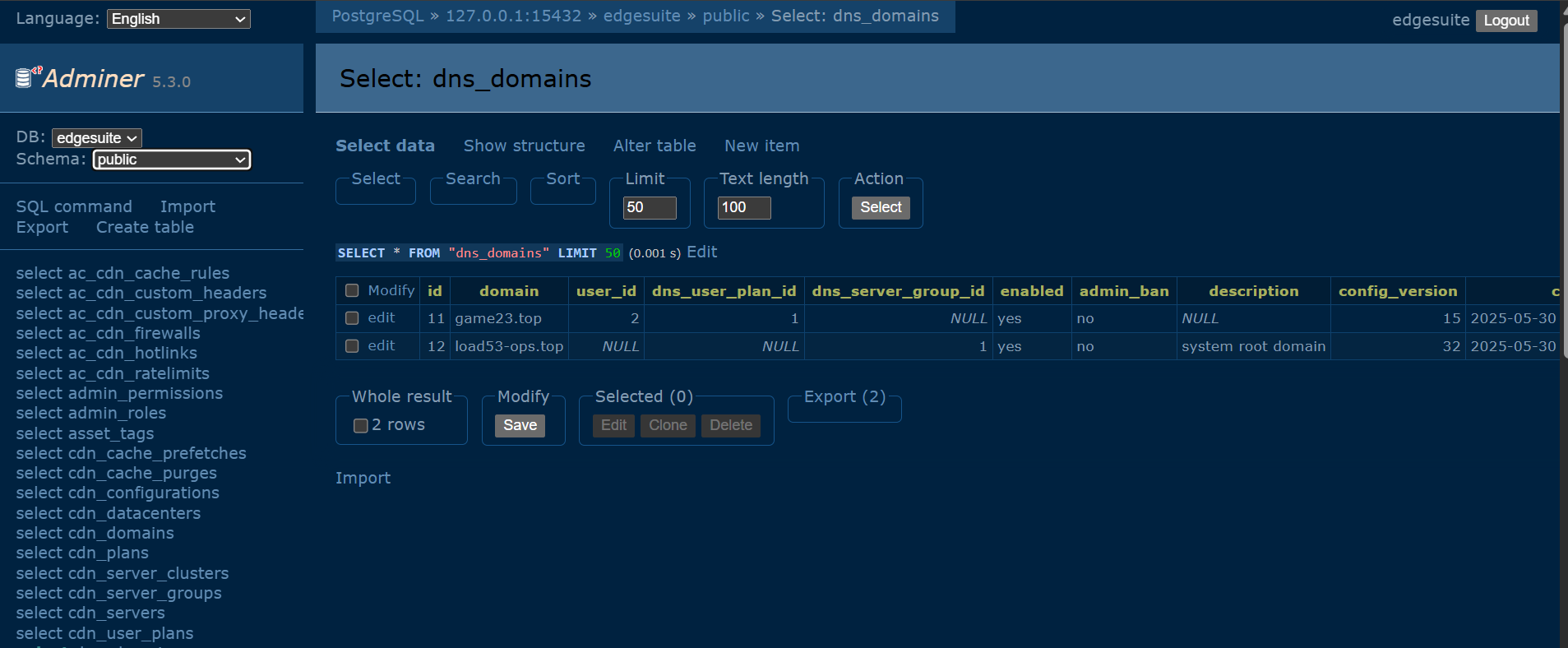 为便于在受控环境(如开发、测试、预发布)中进行数据库访问,部署了基于网页的 SQL 管理工具如 Adminer。