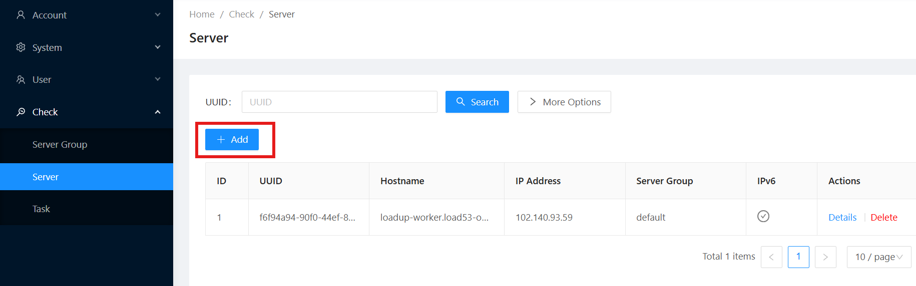 Check > Server页面,点击添加创建新的 Worker。 -