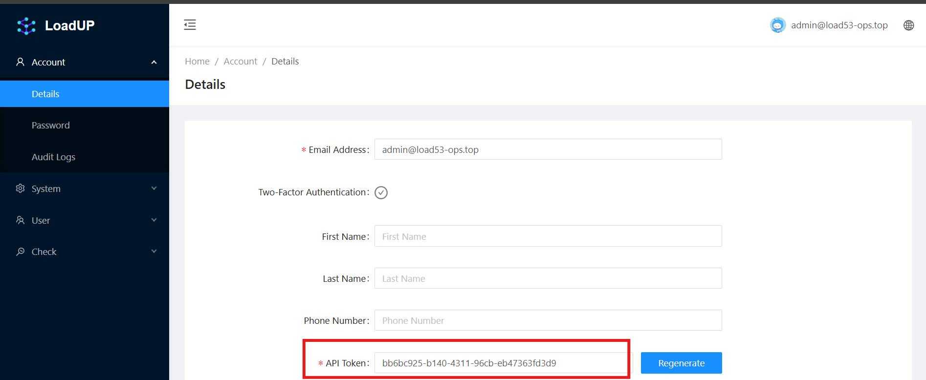 Account > Details页面,记录API Token,用于 DNS Healthchecker 的.env配置中的loadup_worker_api_key。Note